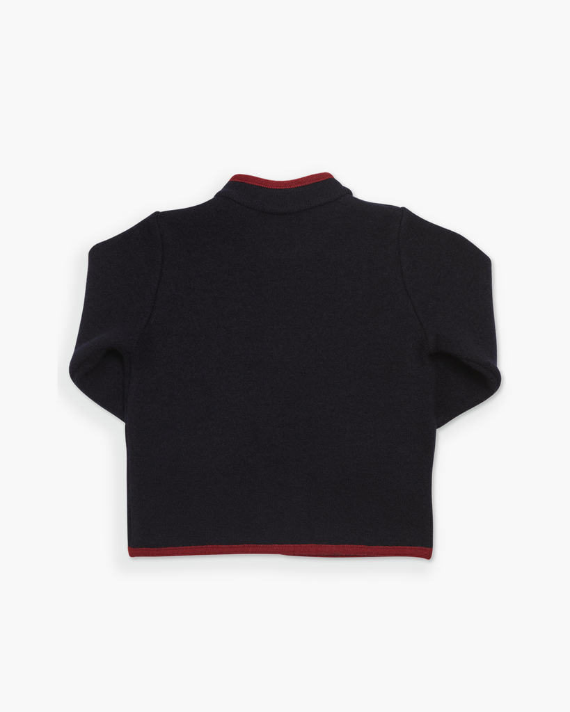 100% boiled wool. Trimmed with burgundy edging and elbow patches. Brushed nickel button fastening. Front pockets. Made in Spain.