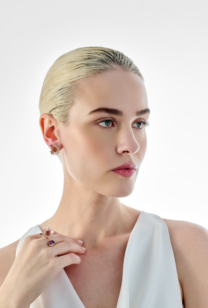 London-based Anabela Chan’s background in architecture and luxury fashion led to the first fine jewelry line to champion laboratory-grown gemstones. Today, its artisanal craftsmanship and sustainable innovations have found a place in the collections of royals, Rihanna, Taylor Swift, and sophisticated women worldwide. The Blueberry Petunia Studs celebrate color and creativity through the brand’s signature Fruit Gems™, gemstones synthesized from fruits and vegetables with bio-resin. Handcrafted in 18K yellow gold vermeil with 14K gold posts, each petunia-shaped earring features Blueberry Fruit Gems™ imbued with natural blue hues from anthocyanins, adorned with trillion-cut orange sapphires and pavé-set orange sapphires for a vibrant, painterly contrast.