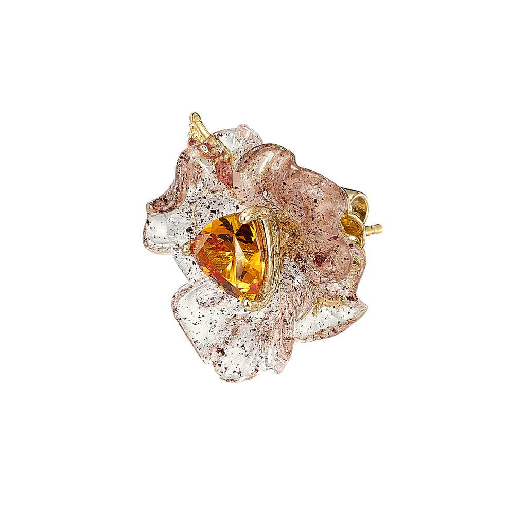 Metals: 18K yellow gold vermeil, 14K gold posts. Synthesized gemstones: Blueberry Fruit Gems™ flowers, two trillion-cut orange sapphires totaling 2 carats. Natural gemstones: pavé-set orange sapphires. Handcrafted in the United Kingdom.