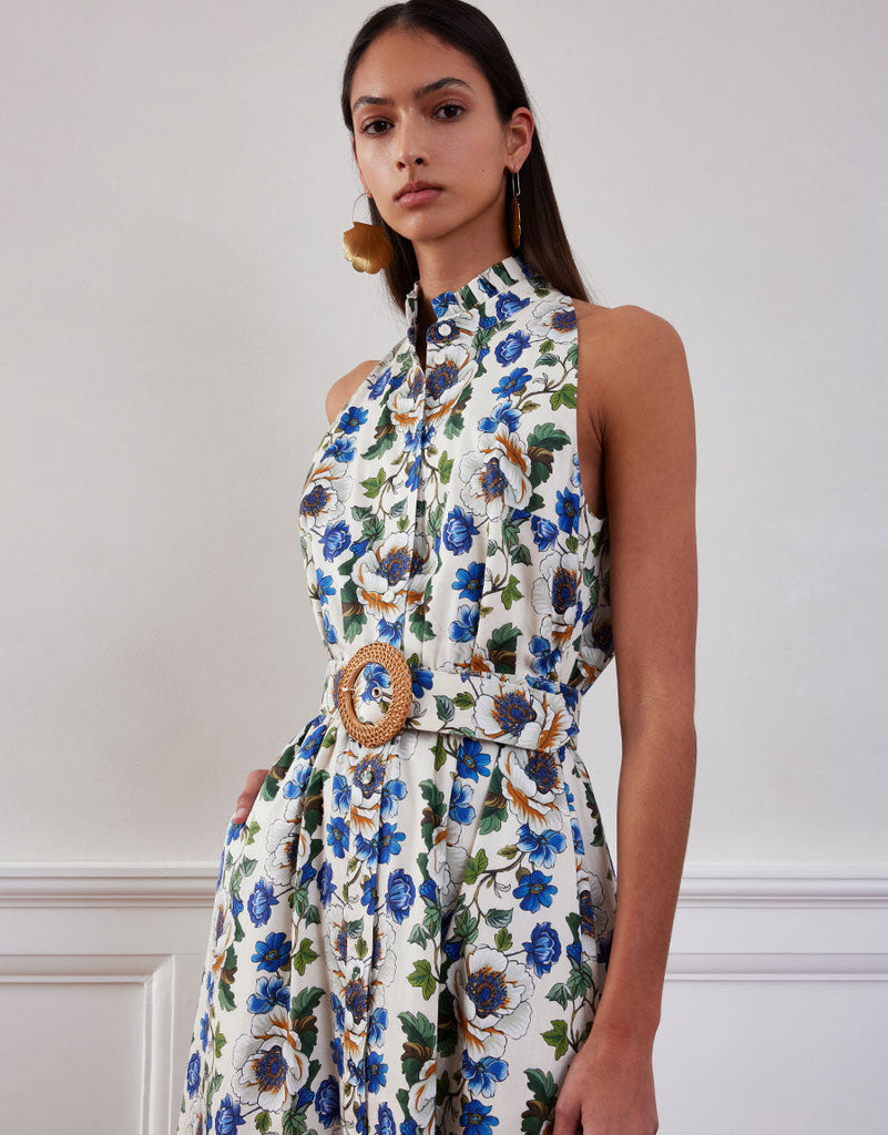 The Biba Cotton Maxi Dress in Off White Vine Flower is a feel-good, wear-anywhere silhouette that flatters every time. Designed with a ruffled high collar, a cinched elastic waist, a wicker-inspired buckle, and practical pockets, it blends ease with effortless elegance. Updated in the Vine Floral print—soft greens and blues against warm off-white—it delivers maximum impact with minimal effort.