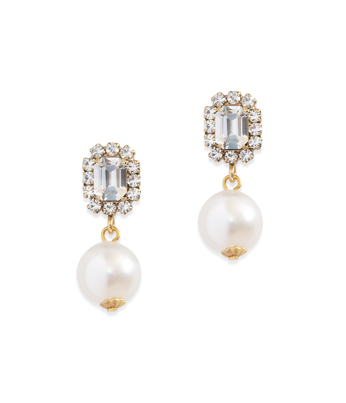 Hand-set crystals, glass pearls, an 18K antiqued gold finish and surgical steel posts. Handmade in the USA.