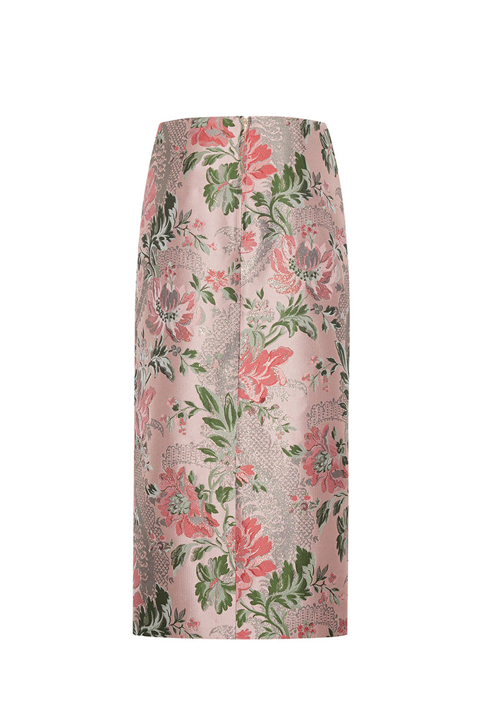 Midi-length fitted pencil skirt in vintage floral jacquard. Center back zipper with hook-and-eye closure. Center back vent. Darts at front and back for a waisted look. Fully lined.