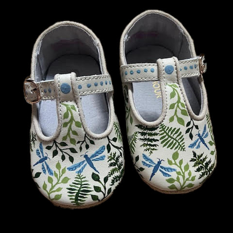 Napa leather. Hand-painted fern, greenery, and dragonfly motif. Cotton piping detail. Velcro closure with metal buckle accent. Soft suede soles. Made in the USA.