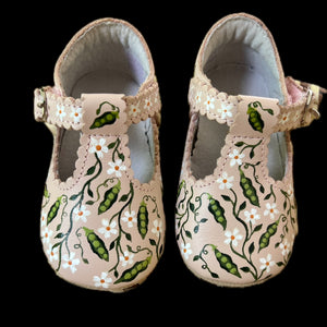 Napa leather. Hand-painted sweet pea and white flower motif. Scalloped detail with Velcro closure and buckle accent. Soft suede soles. Made in the USA.