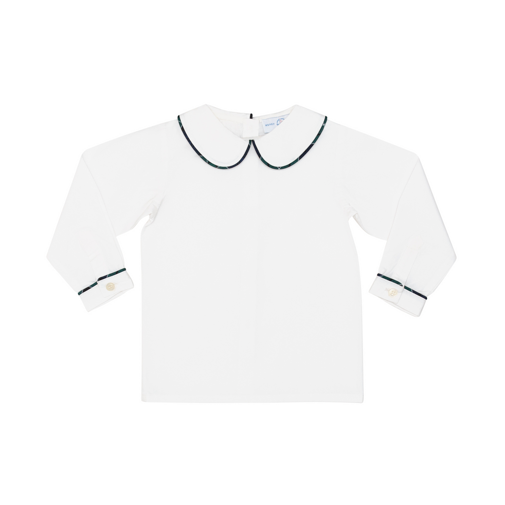 Henry Duvall boys white Peter Pan collar shirt with Newbury Tartan trim, classic holiday layering piece to coordinate with green and navy tartan outfits