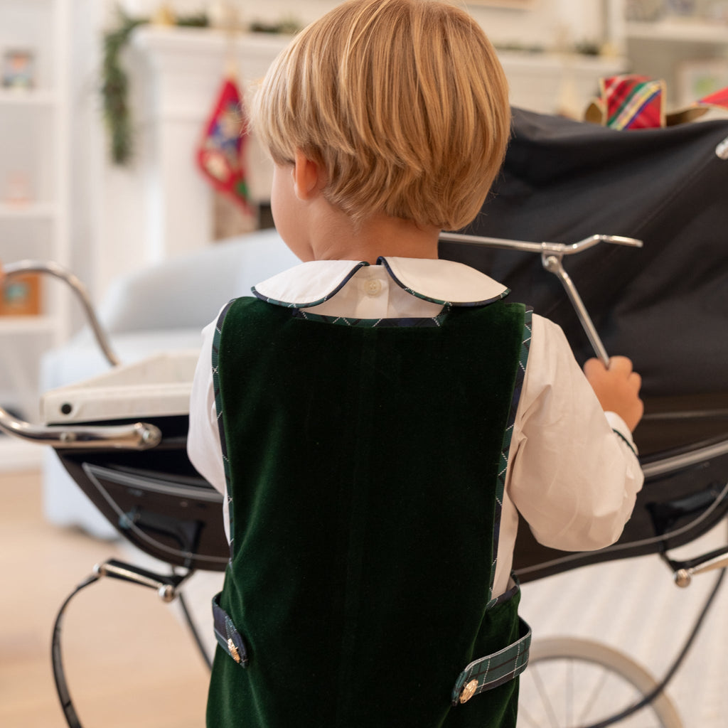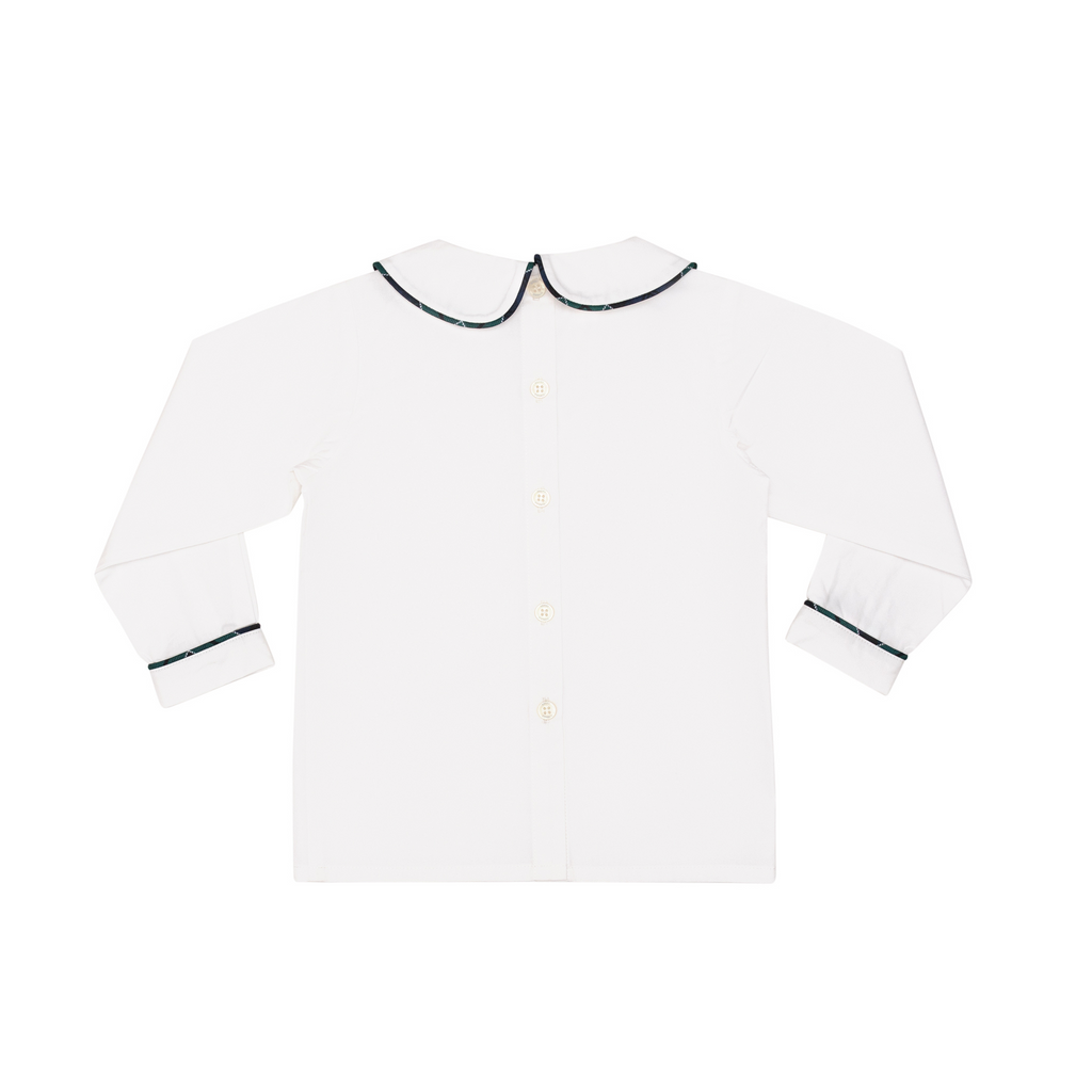 A celebration of the spirit of boyhood, the updated classics from Henry Duvall are curious, imaginative, and sweet. Full of character and playful details, these are easy-to-care-for clothes that families will love. The Long Sleeve Henry Peter Pan in Newbury Tartan gives a festive refresh to a timeless wardrobe staple. Crafted in crisp white cotton with a classic Peter Pan collar edged in rich green and navy plaid, it’s designed to coordinate beautifully with the brand’s Newbury Tartan styles—ideal for sibling matching and family portraits. Timeless and versatile, it layers effortlessly under Jon Jons, bubbles, and short sets, bringing classic polish to every holiday occasion.