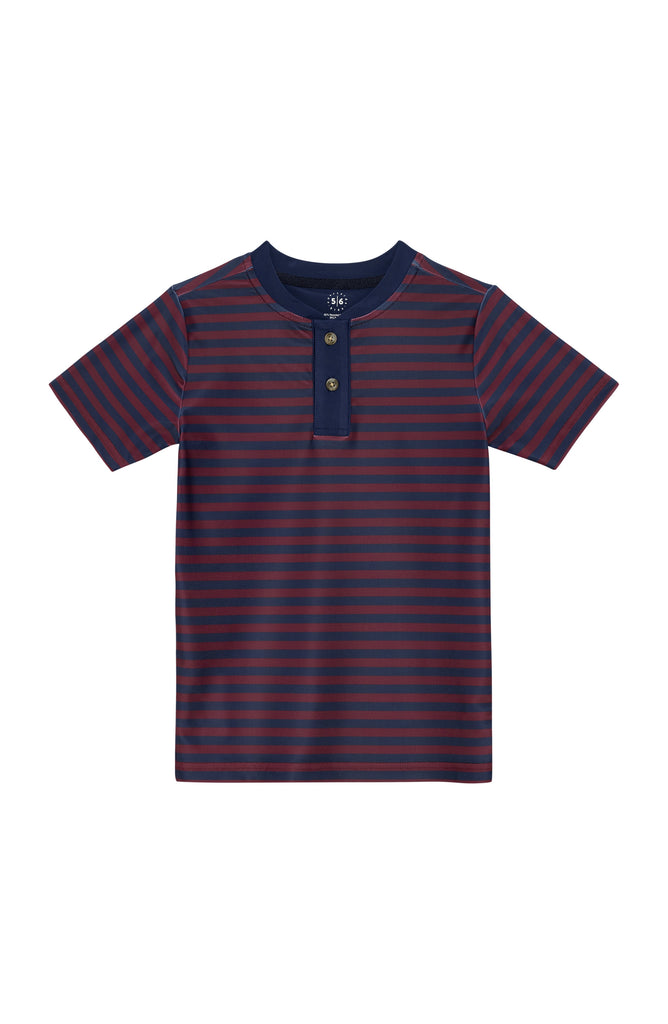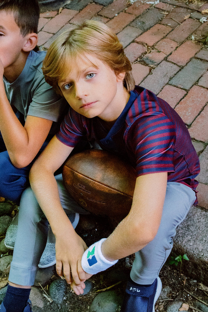 A polished blend of style and sport, Courtside Kids reimagines children’s activewear with performance fabrics, modern tailoring, and a classic athletic sensibility—made for everywhere from the playground to the country club. Introducing the QB Stripe Blade Shirt in Navy & Maroon, the first blade collar designed just for children. Crafted with a sleek, modern twist on the traditional collar, it delivers a polished look that feels effortlessly casual. The cool-touch, wrinkle-resistant, and moisture-wicking fabric ensures comfort and confidence from class to court.
