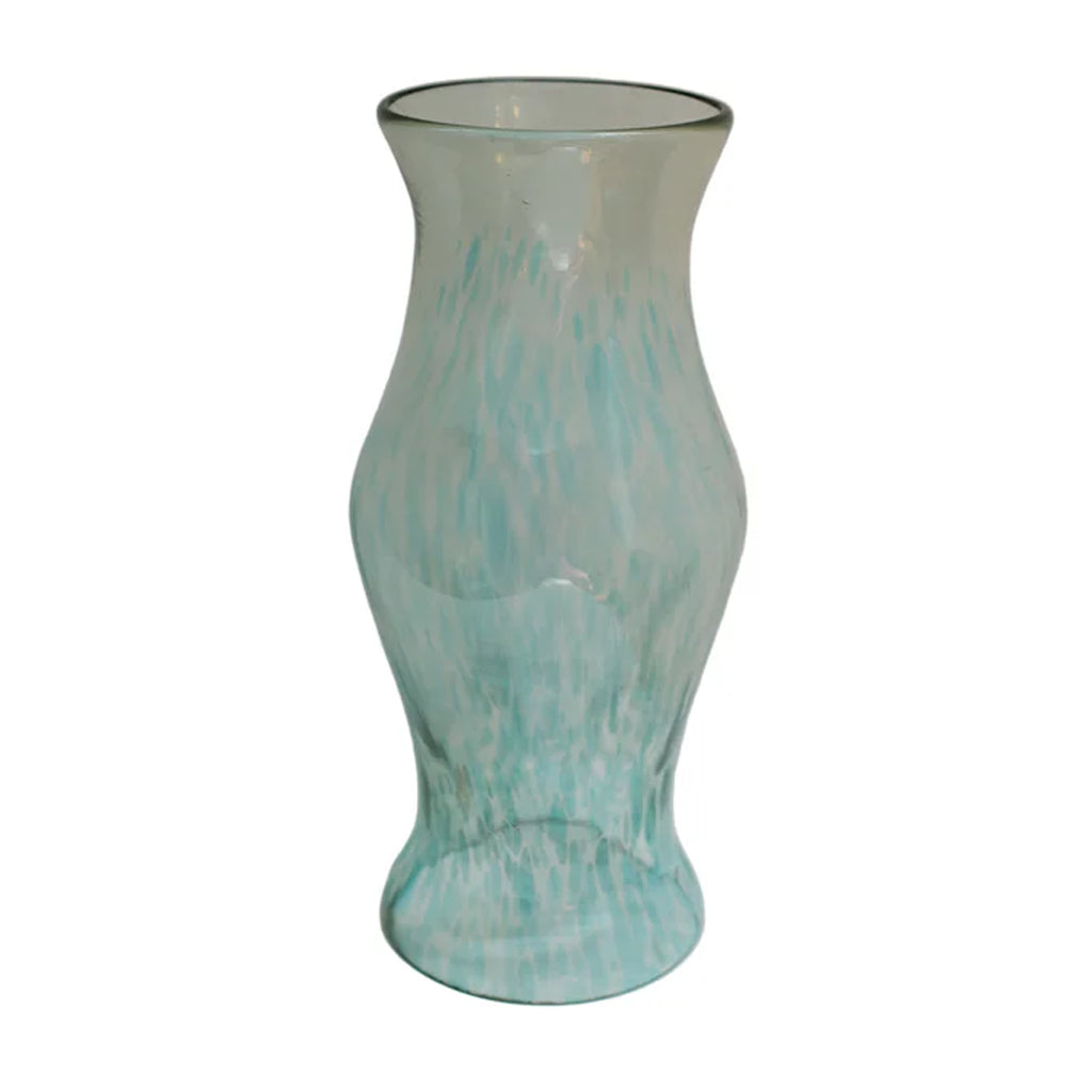 Crafted from recycled glass and blown in Mexico, this 14" hurricane features a 5.5" opening and a classic, versatile shape. This unique finish—a fluid mix of blue and clear glass—creates a light, luminous glow with gentle movement in the pattern. Its subtle marbling brings a fresh, airy elegance to any table or room.