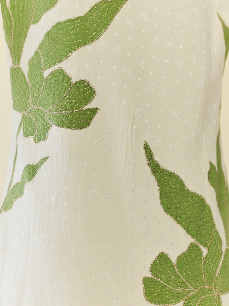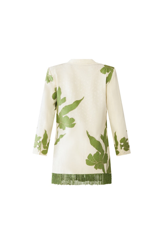The Alex Blazer Dress in Ivory with Green Appliqué brings a touch of modern romance to structured tailoring. Crafted from green jacquard with contrasting floral appliqué, it features a double-breasted front, light shoulder structure, and a clean, straight silhouette. Finished with a fringe trim that moves beautifully with every step, this versatile piece can be styled solo with heels or layered open over pants for a fresh take on classic suiting.