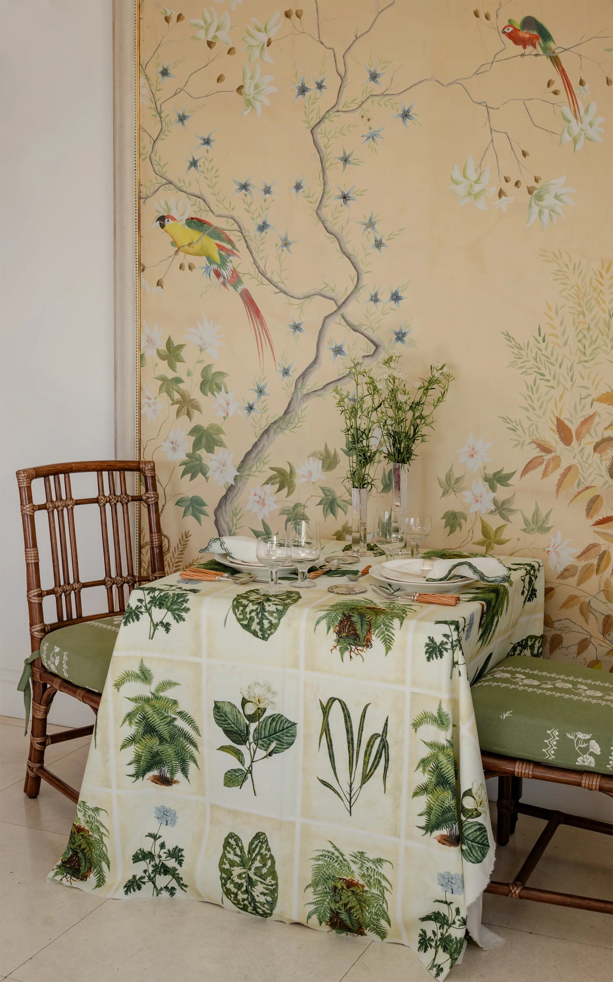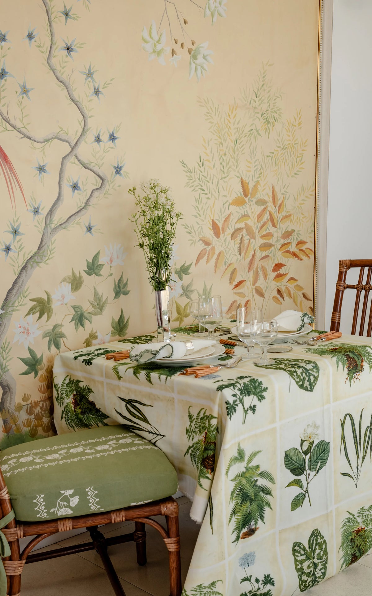 Esencial Hogar’s founder, Celina Wright, wants every gathering around the table a memorable one. What began as a small online shop based in El Salvador offering globally sourced treasures developed into its own collection of table linens —with linens sourced from India and finished by hand in El Salvador—designed to elevate the everyday. The Botanical Print Rectangular Tablecloth is rooted in sentiment and story. The design features large-scale botanical illustrations—from delicate ferns to a blooming magnolia and a vibrant geranium—drawn from a set of artworks gifted to Celina for her wedding. Printed on 100% cotton, each detail pays homage to nature’s quiet beauty and the meaningful moments shared around the table. Whether layered for a formal gathering or styled for a casual outdoor meal, this piece is designed to be timeless, versatile, and enjoyed year-round.