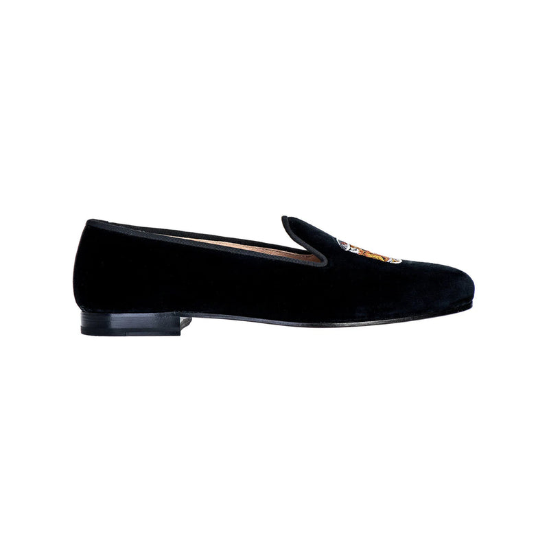 Handmade In Italy. Black velvet exterior with a signature red stripe on the back. Leather sole and lining. Cushioned footbed with suede heel cup. Rubber-injected forefoot for traction and durability.