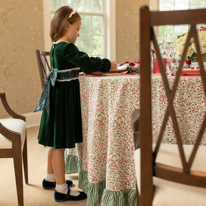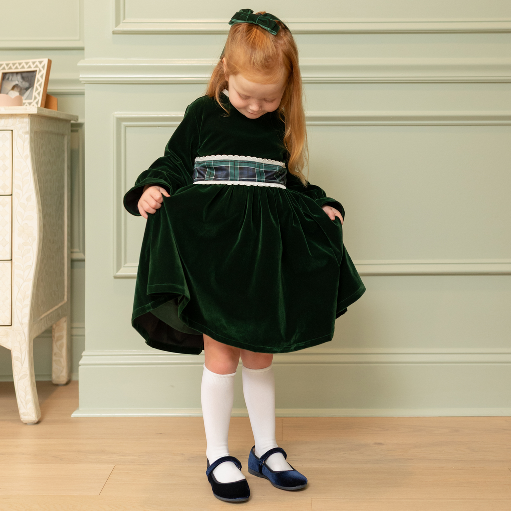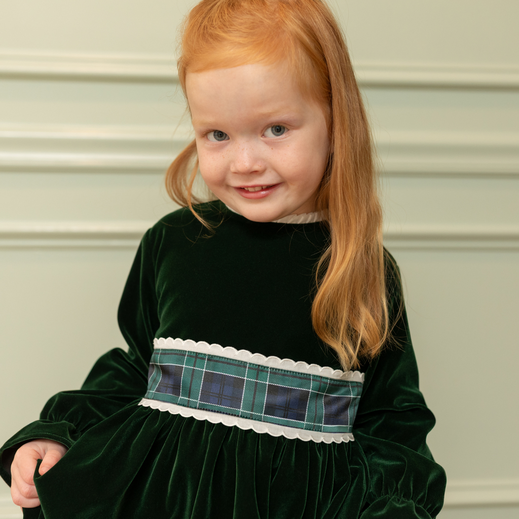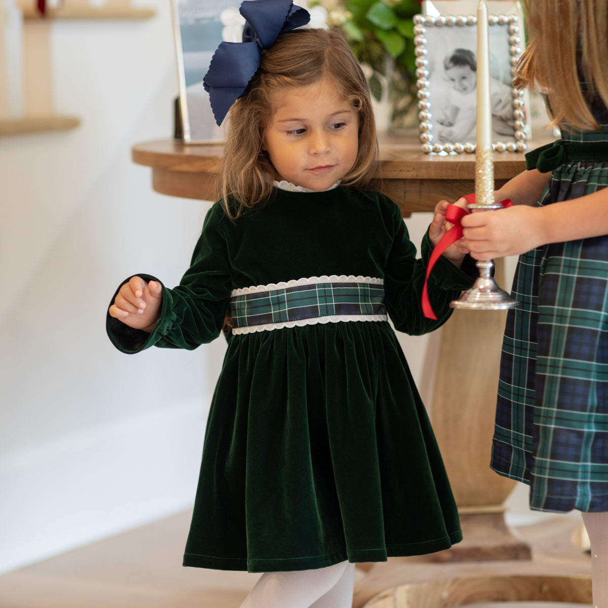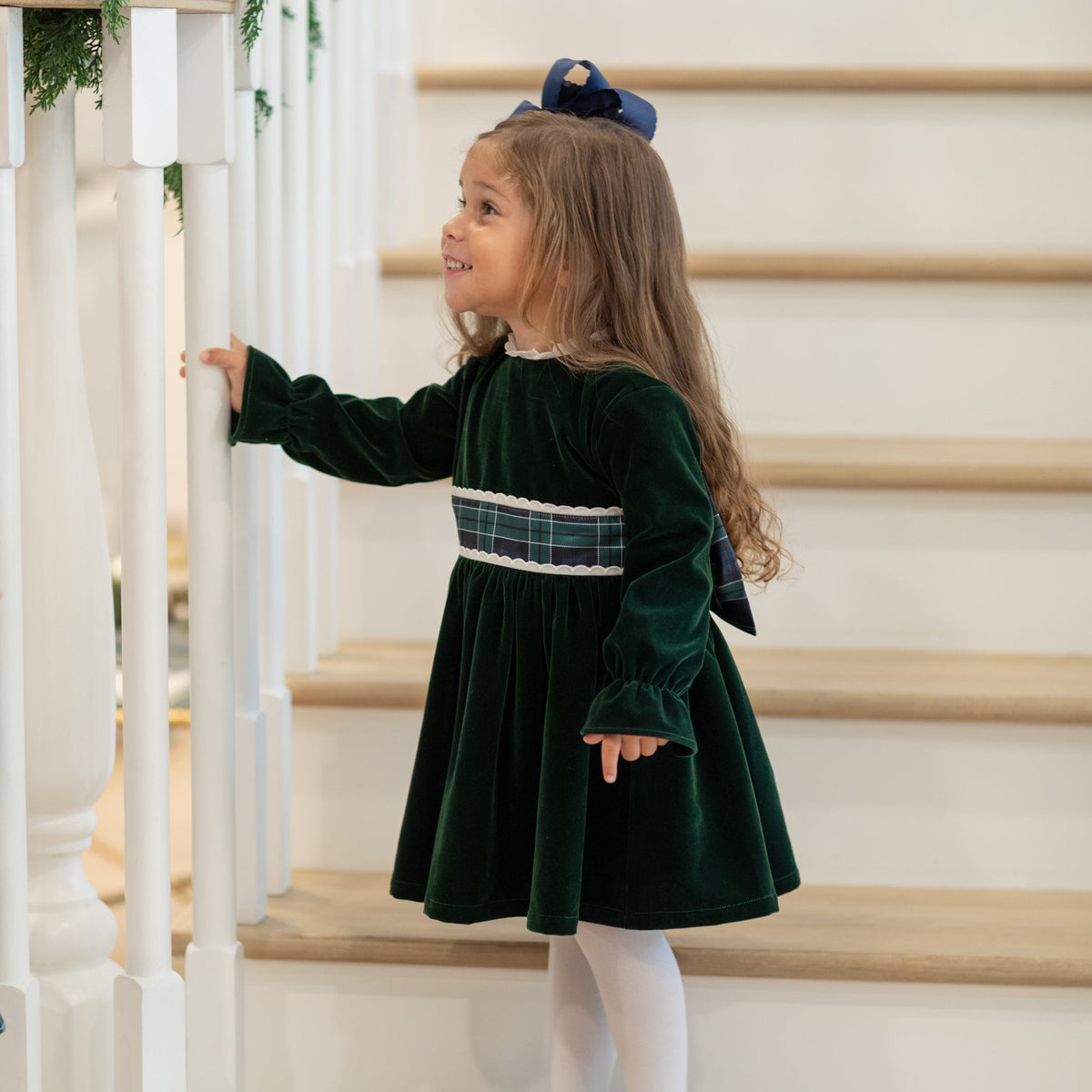 A celebration of the spirit of girlhood, the updated classics from Henry Duvall are curious, imaginative, and sweet. Full of character and playful details, these are easy-to-care-for clothes that families will love. The Eliza Dress in Grafton Green Velvet is a new holiday heirloom that balances elegance with ease. Crafted in luxurious green velvet and finished with a Newbury Tartan sash, this timeless silhouette captures festive tradition with thoughtful detail. A pre-tied bow at the back and delicate white scalloped trim at the neckline and sash lend charm and refinement—making it as effortless as it is beautiful for holiday gatherings and family portraits alike.