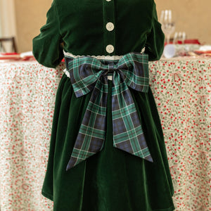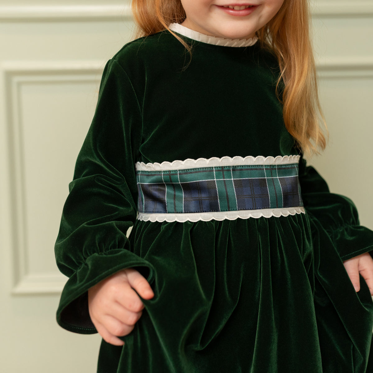 Green velvet. Newbury Tartan sash with pre-tied back bow. White scalloped trim at neckline and sash. Short sleeves. Button-back closure. Fully lined. Coordinates with all Newbury Tartan styles.