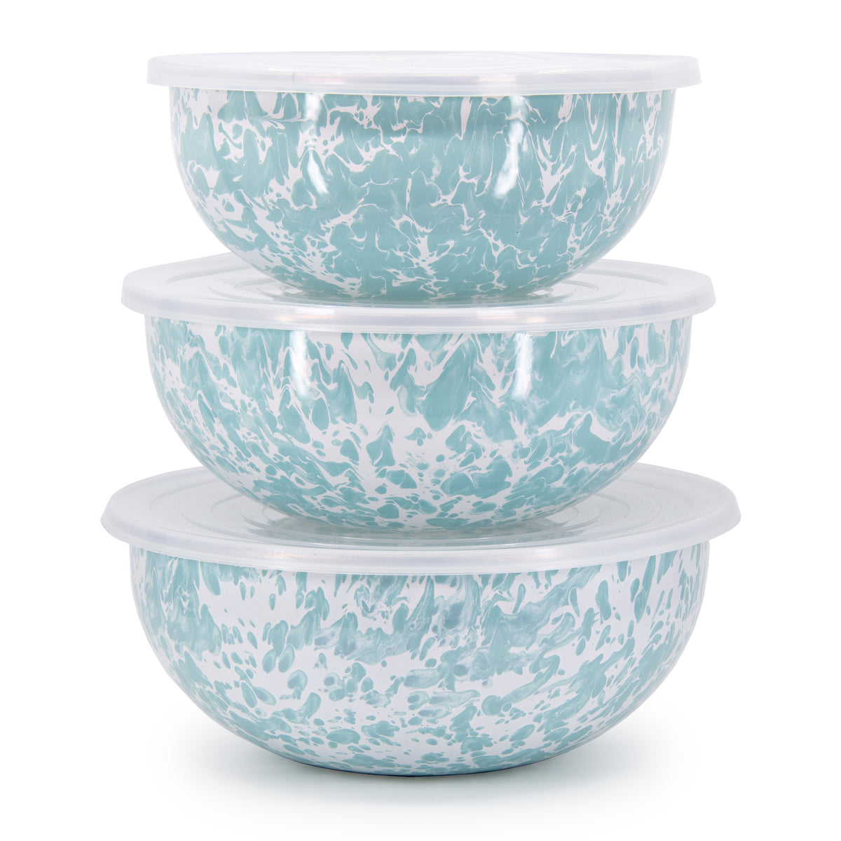 Set of 3 bowls with removable lids. Hardened Enamel Surface. Each piece is hand-dipped and fired at extremely high temperatures causing the steel to contract and fusing the porcelain enamel to the steel, creating a durable, non-porous surface. Non-Toxic.