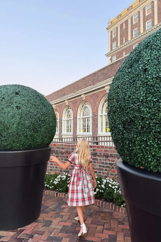 The Joy Kids Dress in Carlyle Plaid brings timeless charm to every occasion. Designed with a fitted smocked bodice and puff short sleeves, this darling silhouette features a crew neckline trimmed with a black velvet Peter Pan collar and a neat back button closure. Finished with a full, twirl-ready skirt and a back sash tie, it’s a sweet standout for picture days, parties, and everything in between.