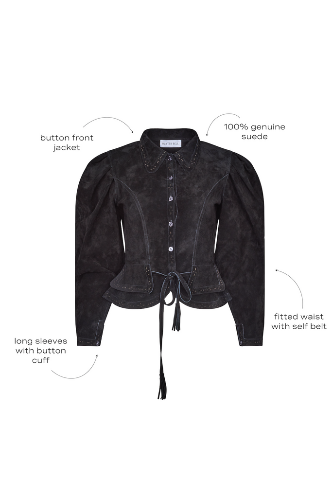 The Murphey Suede Jacket in Noir Suede offers a modern nod to classic Western style. Crafted from rich black suede, it features a button front, long sleeves with button cuffs, and a defined waist cinched by a self belt for a structured yet refined silhouette. Sophisticated and versatile, it pairs effortlessly with the matching Ida Skirt for a sleek suede set that transitions seamlessly from day to night.