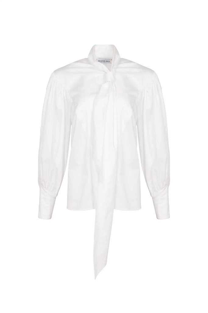 The Shay Blouse in Bright White offers a refined take on a beloved silhouette. Designed with a dramatic tie-front neckline that beautifully frames the face, it combines bold detail with effortless elegance. Long, full sleeves with angled button cuffs lend sophistication, while the relaxed fit brings ease to styling. Pair it with the Ida or Dominic Skirts for a timeless, polished look.