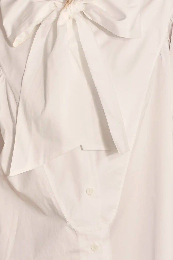 Bright white cotton poplin. Tie-front neckline. Long, full sleeves with angled button cuffs. Oversized fit.