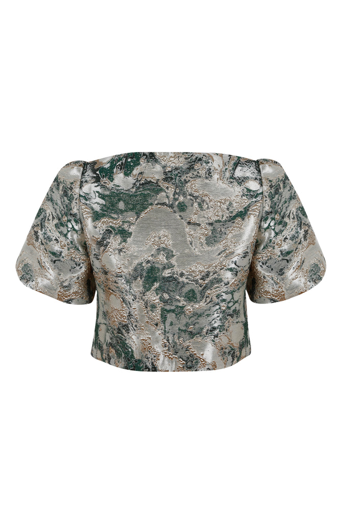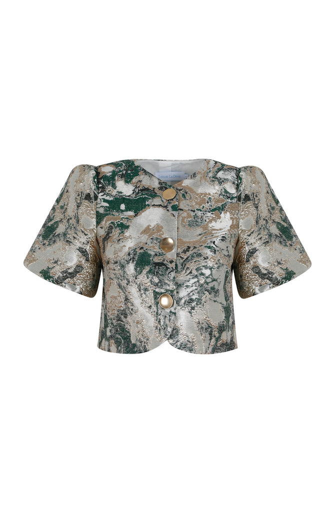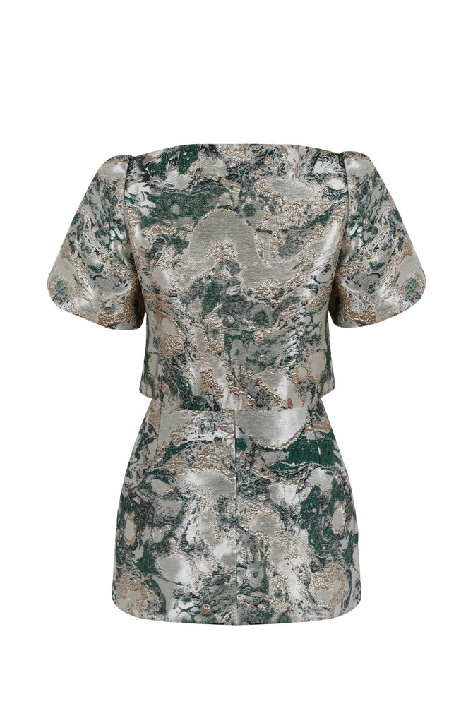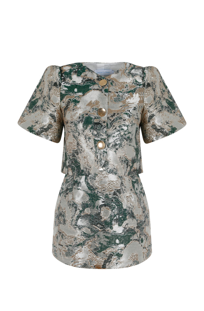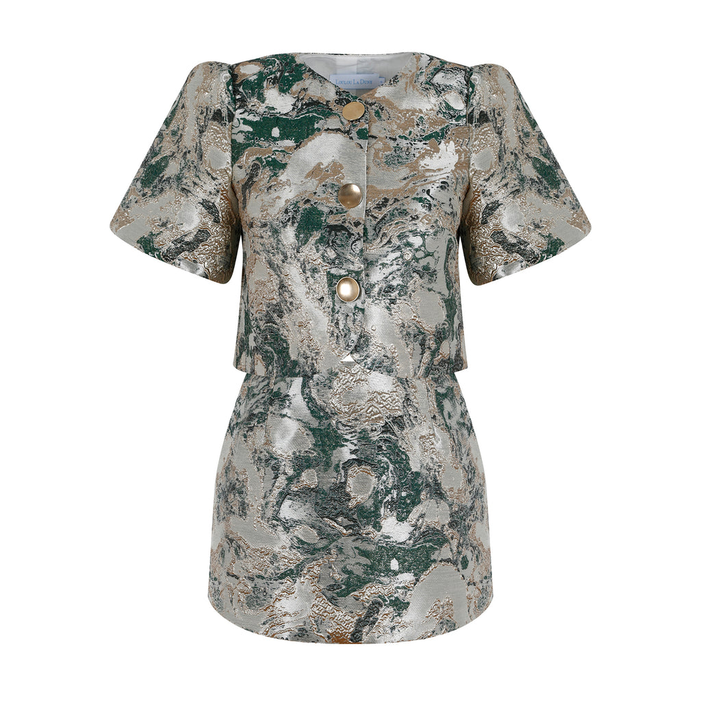 Loulou, founder of Loulou La Dune, extends her refined feminine touch from interior design and tableware into the realm of ready-to-wear fashion—and home entertaining. Recognizing the desire for beautifully crafted, elegant pieces that elevate everyday moments, she designs each collection with an eye for detail and timeless beauty. The Emilia Set in Green & Beige, crafted from rich, shimmering brocade, features a puff-sleeve top paired with a matching A-line mini skirt. A part of the Fall/Winter collection, this chic ensemble blends classic charm with festive sparkle—ideal for holiday parties and winter celebrations.