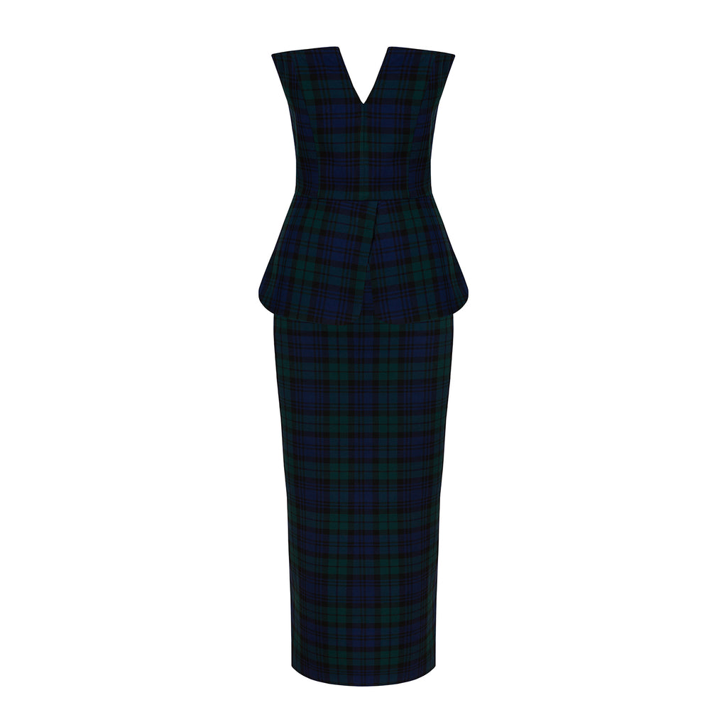 100% polyester. Top: Bandeau neckline with peplum hem, back zipper, interior bustier clips. Skirt: Pencil silhouette with back slit and zipper. Tartan fabrication. Made in Turkey.