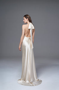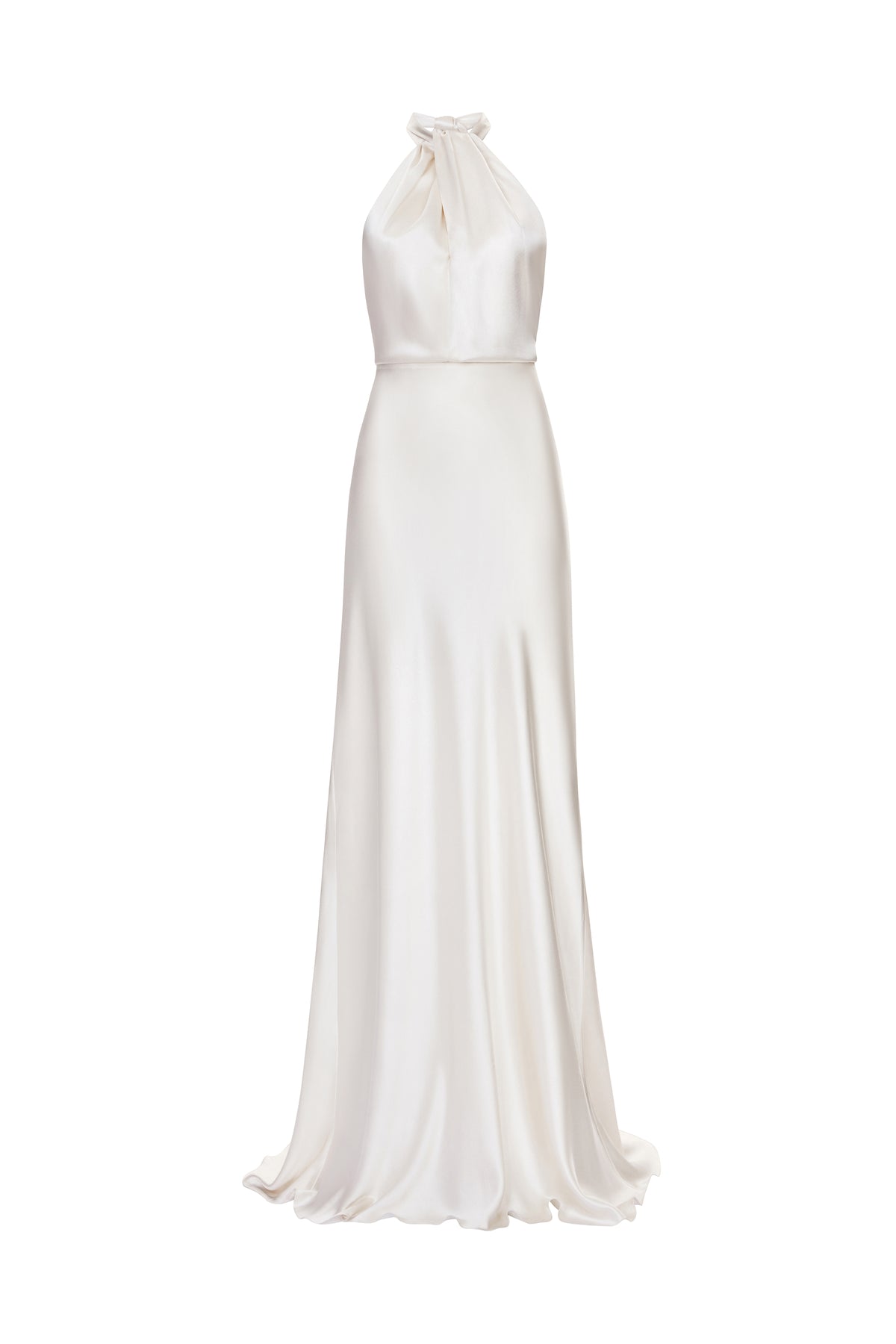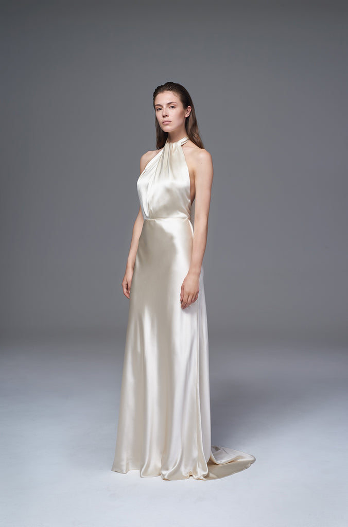 Luxury bridalwear brand Halfpenny London weaves Brit cool with a luxe sensibility, creating innovative, chic dresses and separates for the modern woman. The Cheryl Dress is done in luminescent silk with a sleek halterneck and dramatic long ties that can trail down the back or wrap around the waist for an unforgettable look.