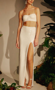 Born in India and raised in New York, where she eventually worked in finance, Natasha Das’s diverse background is at the essence of Danarys New York, a luxury womenswear label that asks its wearer to embrace their strength and fearlessness of their femininity. The Ava Skirt is snow-white, sequined, and sultry with a slit cut up to there. Double down on the shimmer and style with the coordinating Sahra Top.