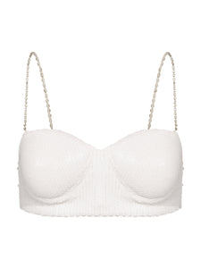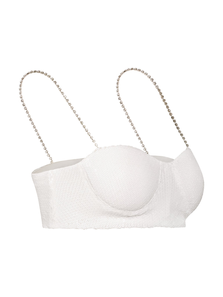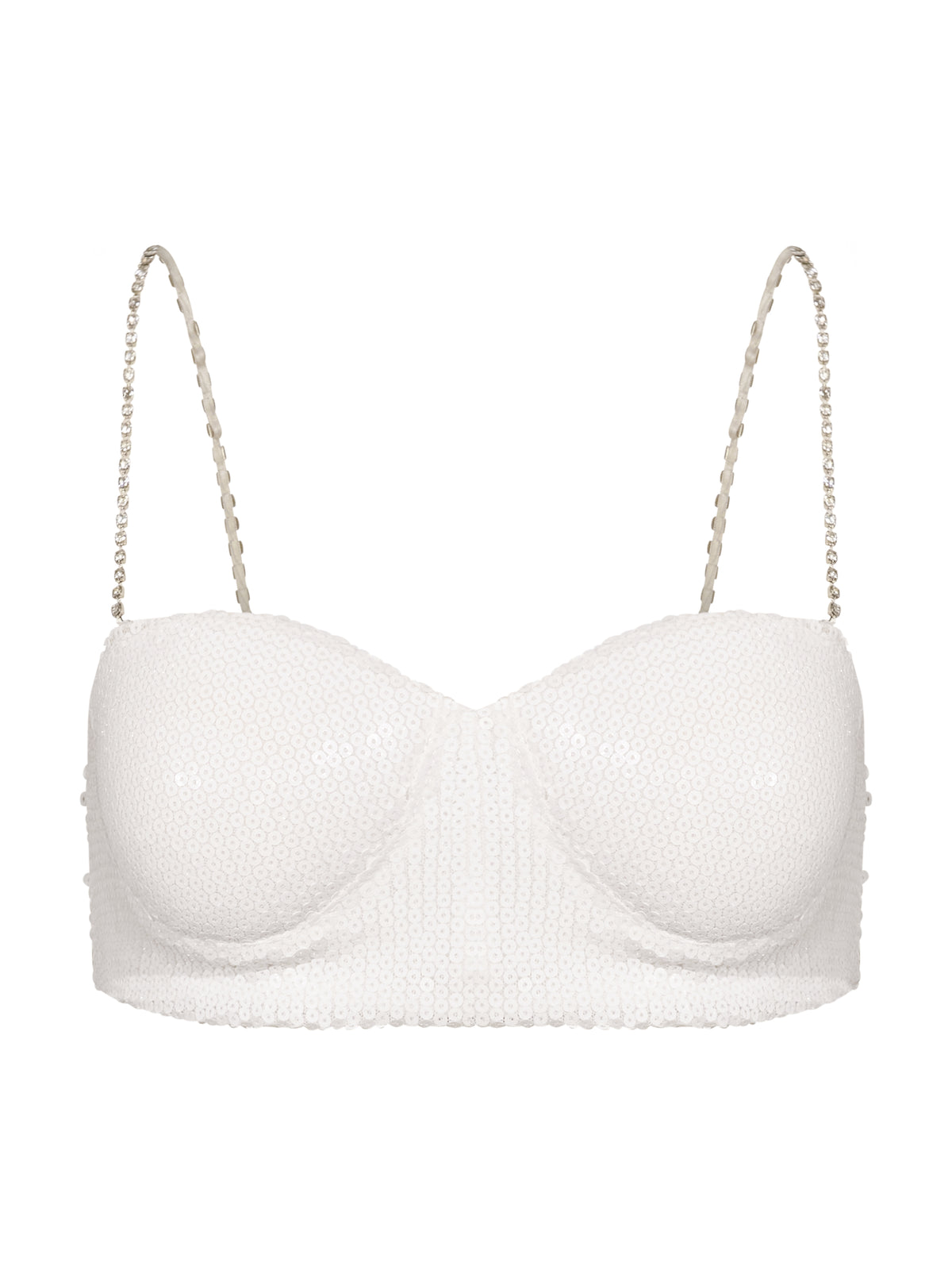 Born in India and raised in New York, where she eventually worked in finance, Natasha Das’ diverse background is at the essence of Danarys New York, a luxury womenswear label that asks its wearer to embrace their strength and fearlessness of their femininity. The Sahra Top is sequined bra top in snow white, with Swarovski crystal spaghetti straps, and underwire structure around cups for support. Looks fabulous under a jacket, but also works well on its own with a matching skirt for a sophisticated, revealing look.