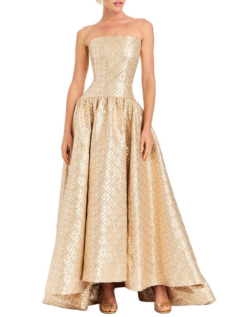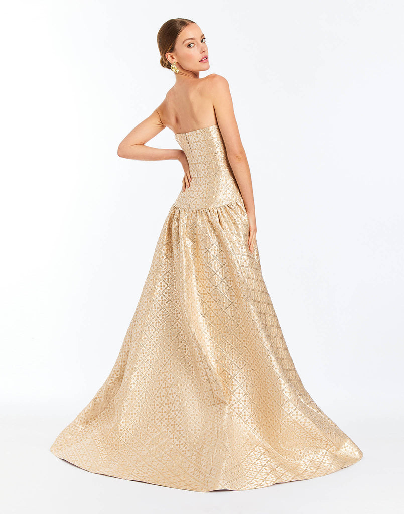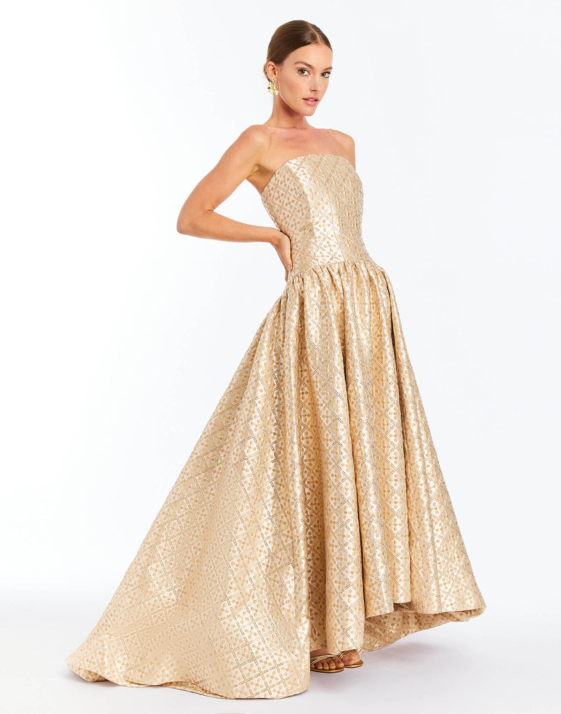 Jacquard in Golden Tile. Strapless gown with drop waist silhouette. Princess seams and boned bodice. Full skirt with ruching detail. Facing at hem. Fully lined. Coordinates with the Tinsley Lady Jacket.