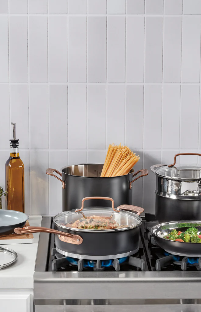 Founded in 1971 by Carl Sontheimer, Cuisinart revolutionized American home cooking by introducing the food processor, inspired by French culinary innovation. Now a leading name in premium kitchen appliances, the brand continues to champion creativity and excellence through thoughtfully designed tools embraced by chefs and home cooks alike. The 11-Piece Matte Black Elegance Set pairs professional stainless steel performance with a refined matte black finish. Designed to elevate everyday cooking, each piece delivers optimal heat distribution and enduring style.