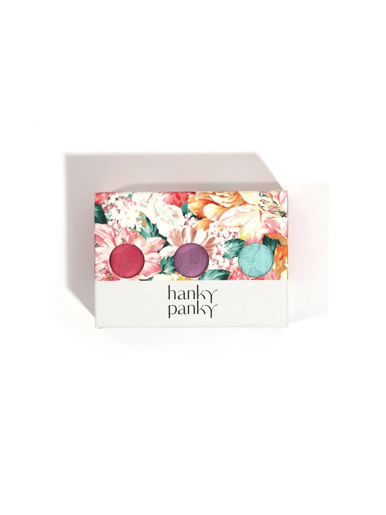 Hanky Panky’s signature V-front and V-back waistband revolutionized the world of lingerie 30 years ago and has put an end to panty lines. Soft and stretchy, Hanky Panky officially makes the World’s Most Comfortable Thong. Fitting low on the hips and will easily roll up in your lingerie drawer, the 3-Pack Signature Lace Low Rise Thongs in Printed Box features three thongs of different colors in stretch lace.
