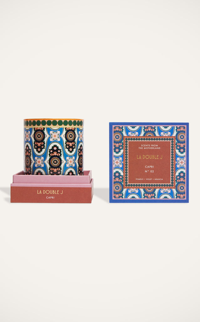 The inspiring authority on feel-good fashion, energy elevation, and the ebullient Italian way of life, La DoubleJ was launched in 2015 by J.J. Martin. Beginning as a magazine, the brand soon took flight in 2017 with original collections of new fashion and homeware with in eye-popping prints, cut with easy glamour. The 320G Candle in Capri Light Blue is a jubilant tribute to the sun-soaked island of Capri, blending pomelo, violet, and arancia with a medley of fruit and wood notes. Encased in a hand-painted porcelain vessel trimmed with 18K gold, this radiant candle brings a touch of Mediterranean magic to any space—even after the last flicker fades.