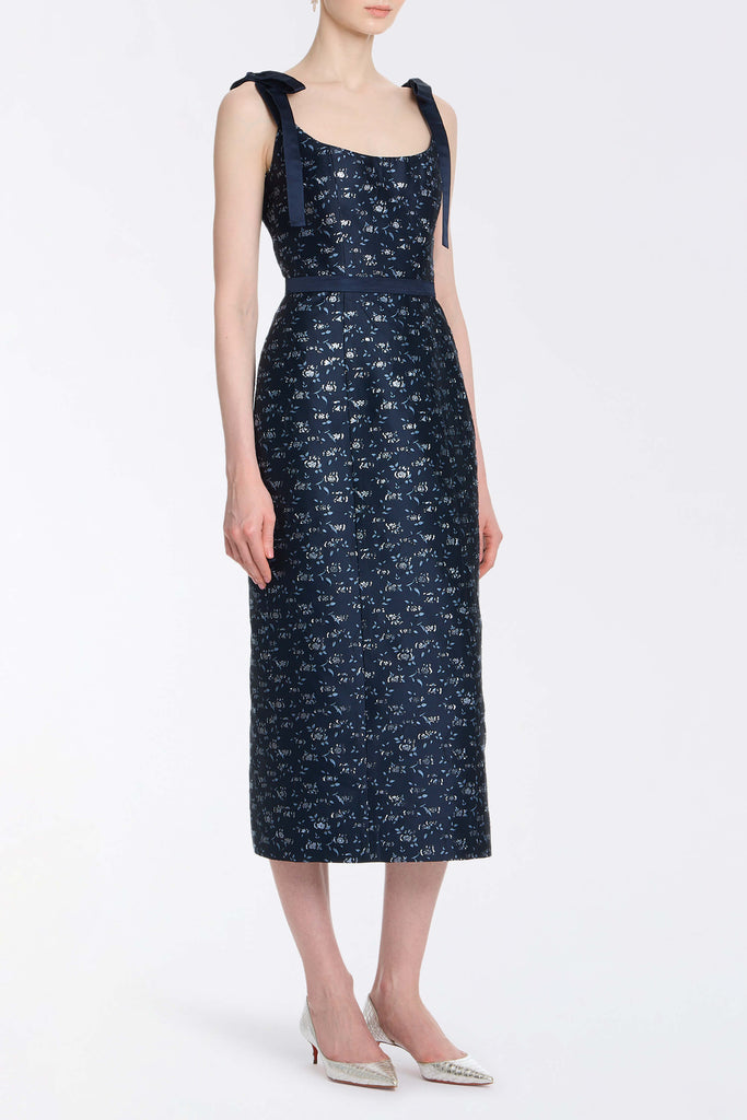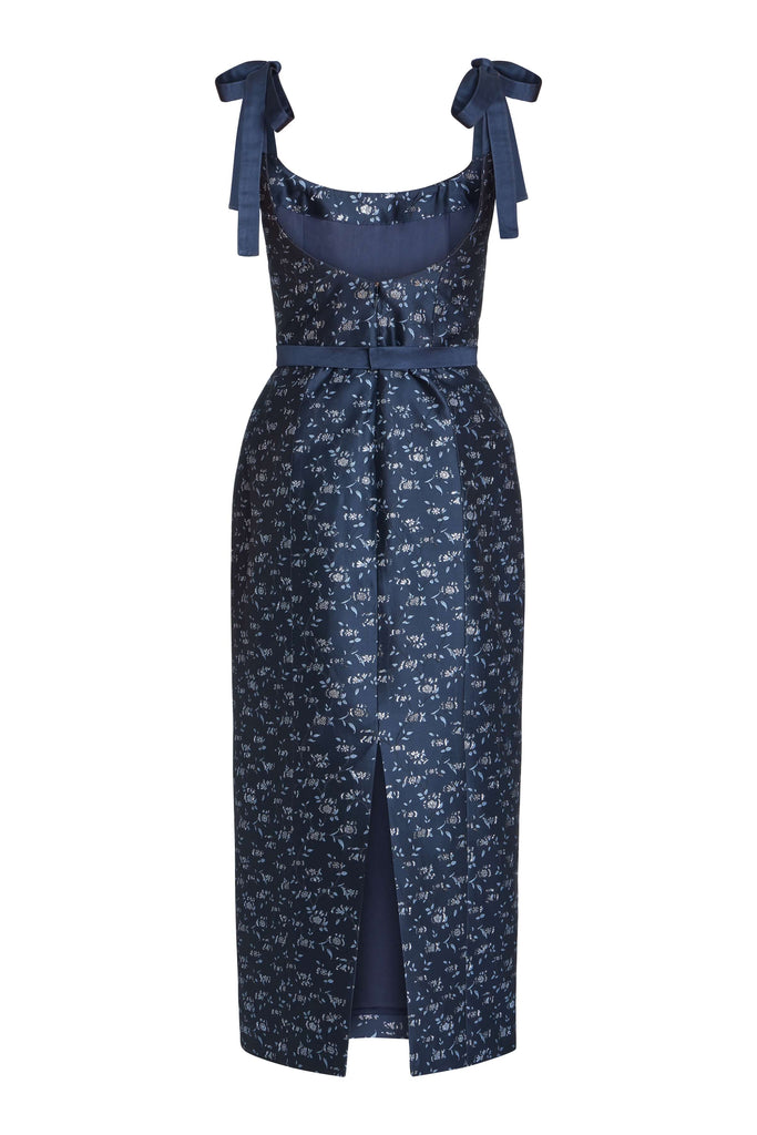 Named after a radiant group of galaxies, Markarian combines designer Alexandra O’Neill’s love of the cosmos and celestial romanticism with timeless design and modern silhouettes. A forward-thinking approach to fashion and a focus on fine craftsmanship mean Markarian is beautiful and impeccably well-made. The Acacia Navy Floral Brocade Corset Midi Dress features a scoop neckline, structured corset bodice, and contrast tie straps that lend a romantic touch. Finished with a detachable belt, back slit, and full silk lining, it embodies Markarian’s signature balance of elegance and modern femininity.