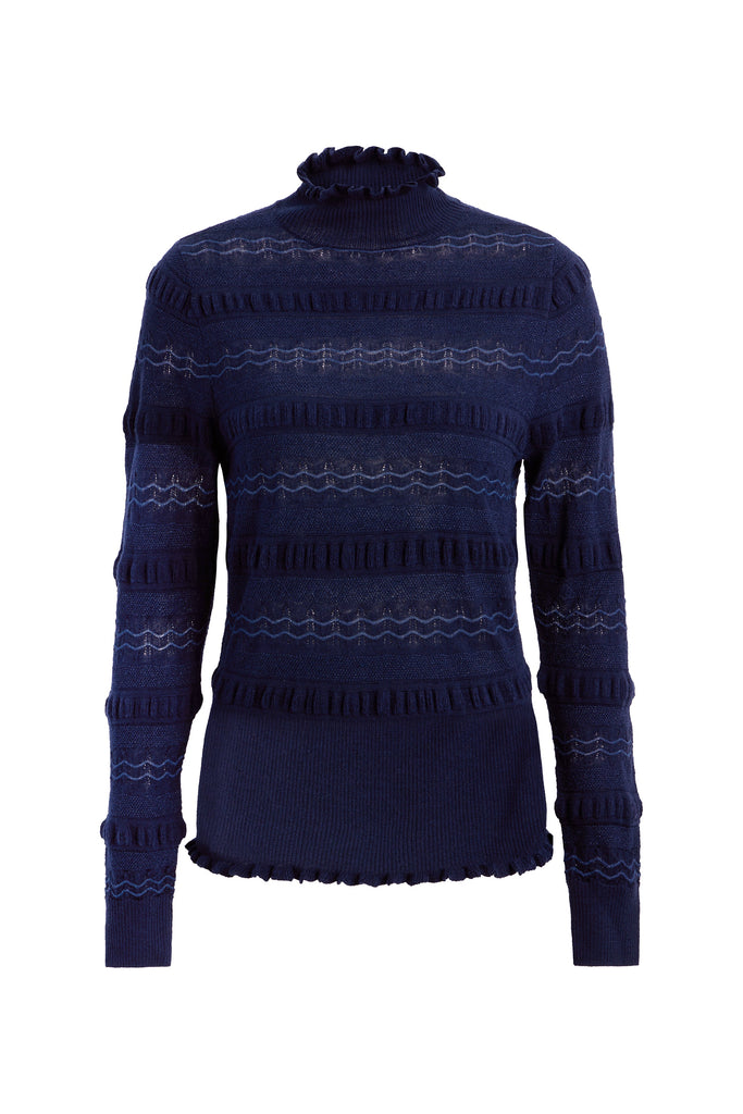 70% wool, 24% silk, 4% polyester, 2% lurex. Fold-over ruffle turtleneck. Fitted through body and sleeves. Delicate pointelle knit with subtle shimmer. Unlined.