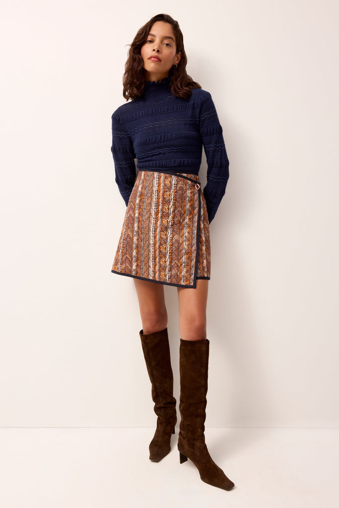 Empowering women through vivid hues and the joy of style, Sarah Doggett Evenson uses her archive of artistic prints, fine fabrics, and flattering silhouettes to make each Marie Oliver piece instantly uplifting. The Adison Top in Pacific is a body-skimming turtleneck elevated with allover folded ruffle details and a delicate pointelle knit woven with metallic yarn for a subtle shimmer. The deep Pacific hue strikes a balance of feminine charm and seasonal sophistication, pairing beautifully with contrasting textures and autumnal tones.