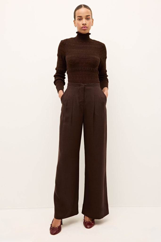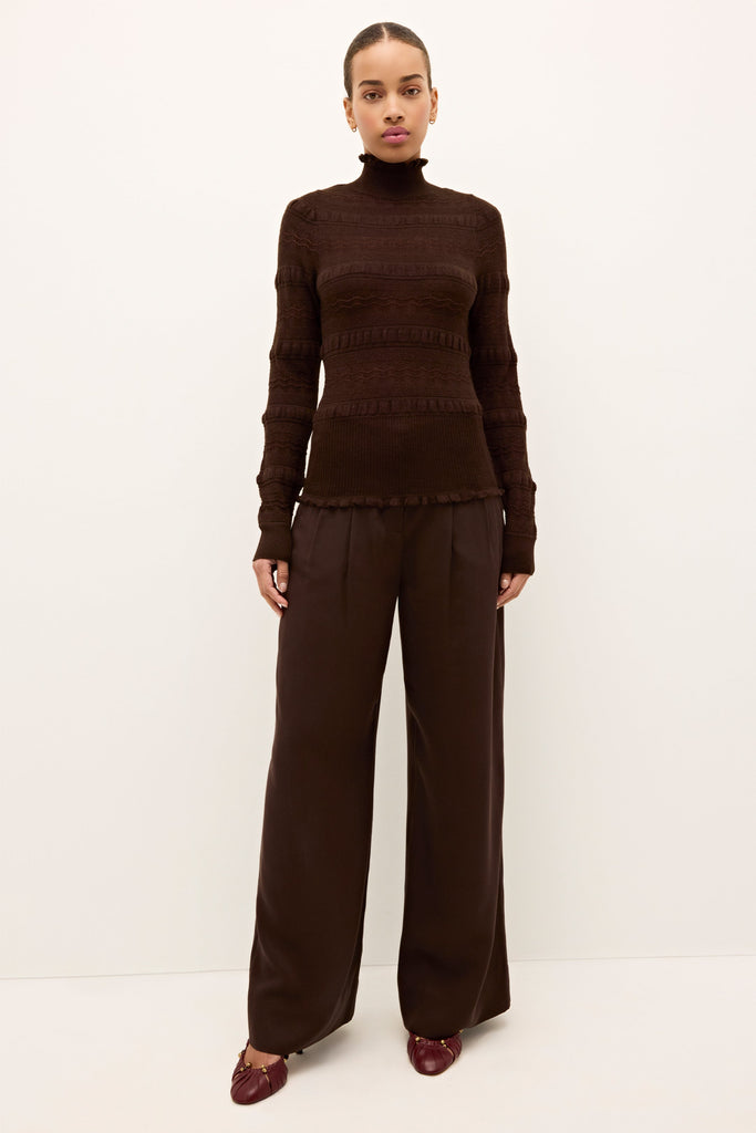 Empowering women through vivid hues and the joy of style, Sarah Doggett Evenson uses her archive of artistic prints, fine fabrics, and flattering silhouettes to make each Marie Oliver piece instantly uplifting. The Addison Top in Sepia gives the utilitarian turtleneck a feminine upgrade with folded ruffle details and a delicate pointelle knit woven with metallic yarn for subtle shimmer. Rendered in rich dark brown—this season’s most underrated neutral—it pairs effortlessly with the matching Macbee pant in Walnut for a sophisticated tonal ensemble.