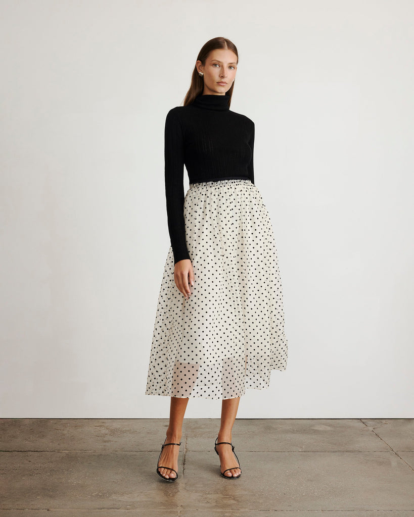 Silk organdy. Sheer polka dot design. Stretch grosgrain waistband. Side pockets. Midi length. Fully lined.