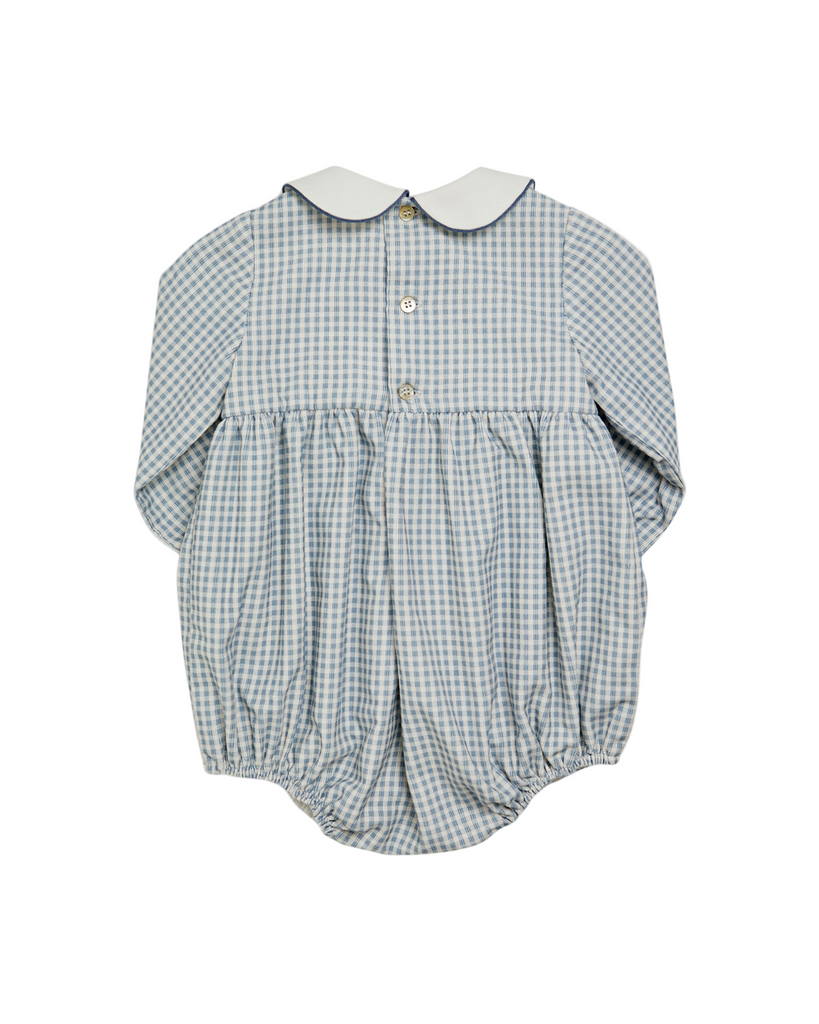 Blue Vichy baby corduroy. Contrasting Peter Pan collar. Pleated bodice with button detail. Elasticated cuffs. Back and crotch button closures. Fully lined. Made in Spain.