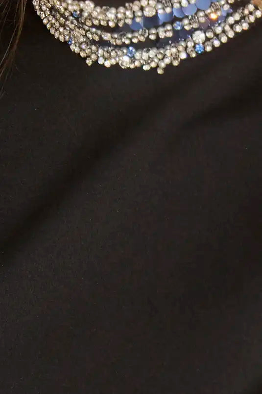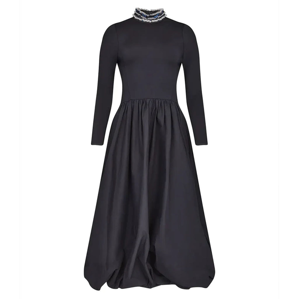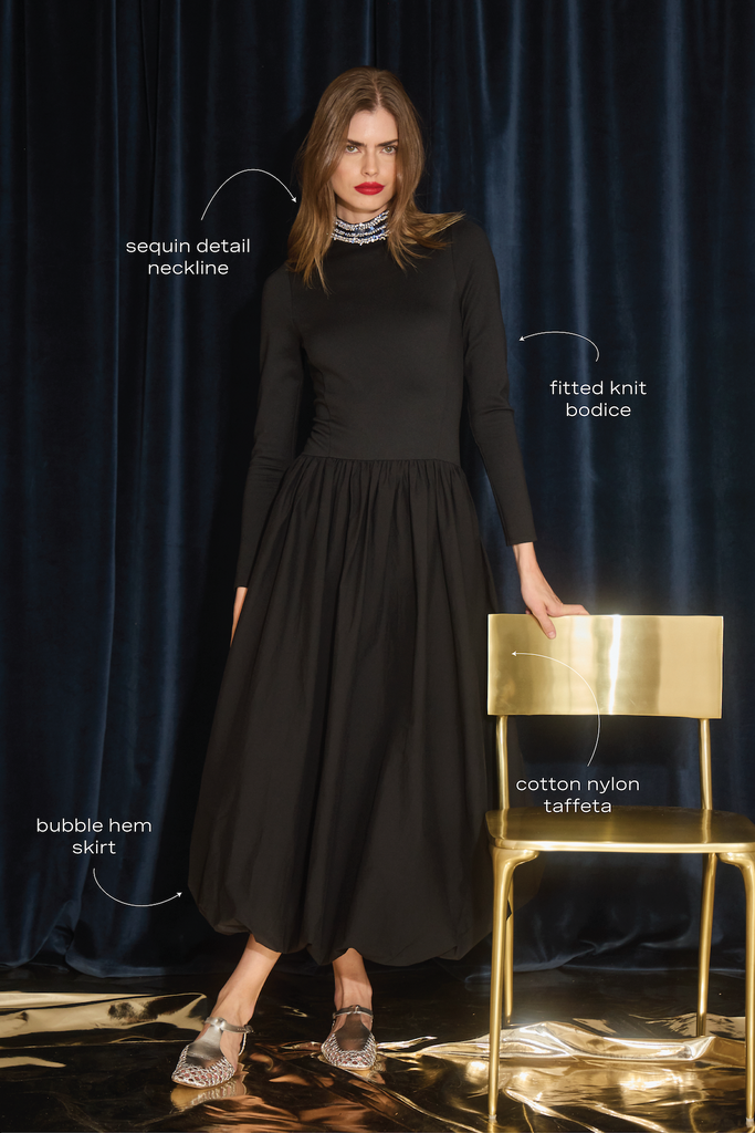 The Alexandra Dress in Onyx channels effortless ’80s glamour with a modern edge. Featuring a fitted knit bodice with long sleeves and a dramatic dropped-waist bubble skirt in lustrous taffeta, it blends sleek comfort with festive sophistication. A jeweled, sequin-trim neckline adds a touch of sparkle, making it an elevated choice for evening occasions and celebratory nights out.
