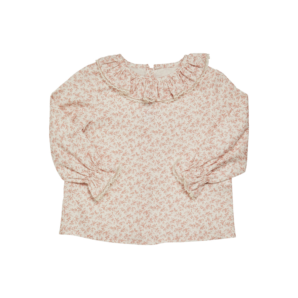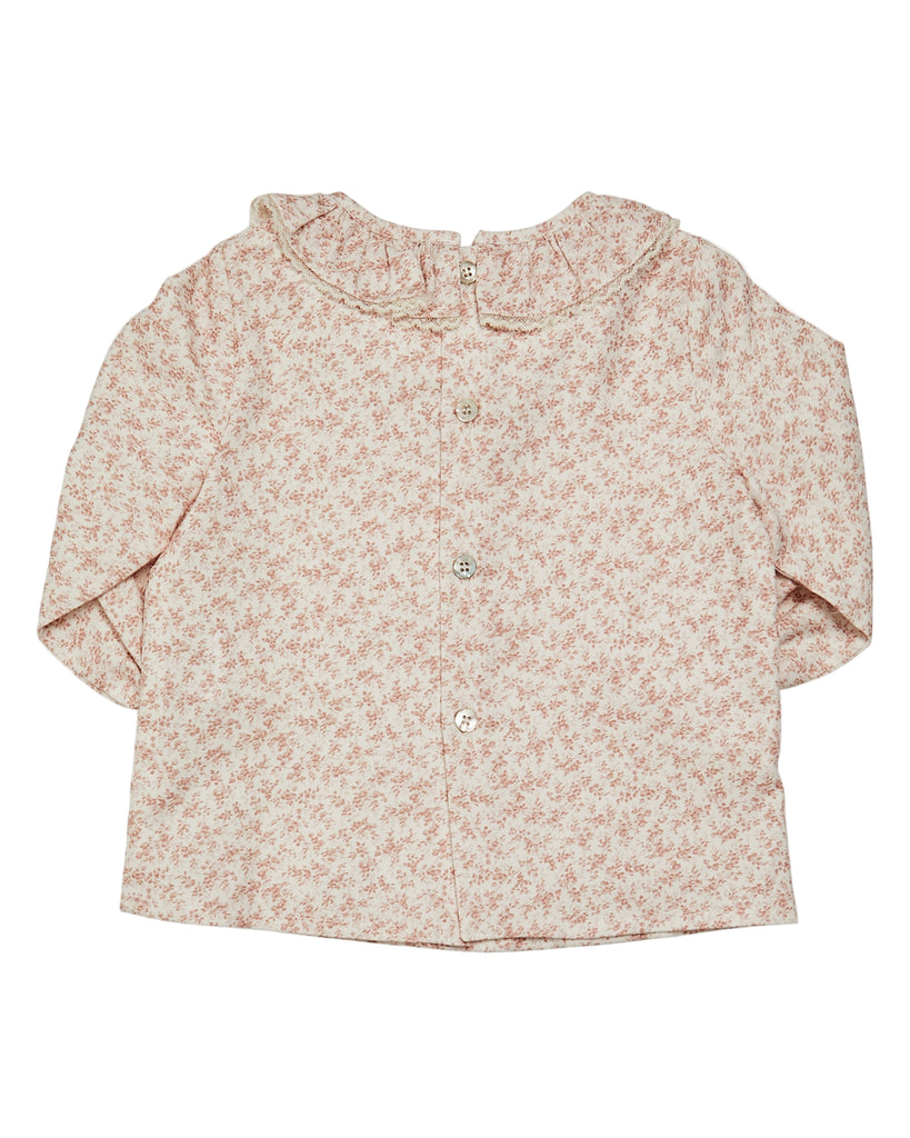 Pink floral cotton. Ruffled collar. Elasticated cuffs. Back button fastening. Long sleeves. Made in Spain.