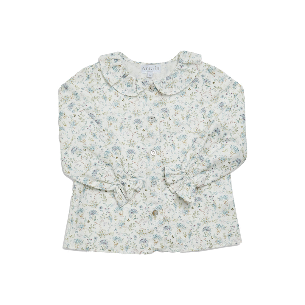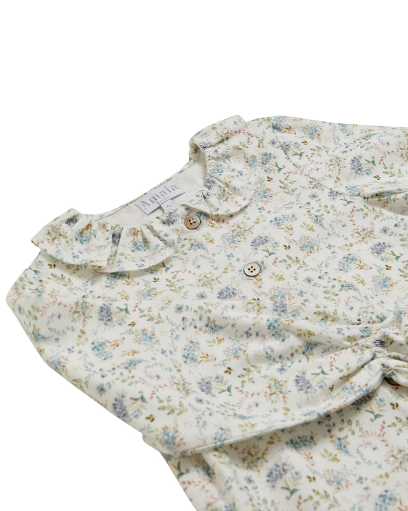 The Amelia Blouse in Dusty Blue Minifloral is a delicate and timeless piece designed to bring charm and grace to your little one’s wardrobe. Crafted from soft floral cotton, it features a ruffled collar, elasticated cuffs, and front button fastening for a refined finish. Effortlessly elegant and versatile, it pairs beautifully with Amaia’s coordinating skirts, shorts, or trousers for a polished, feminine look.