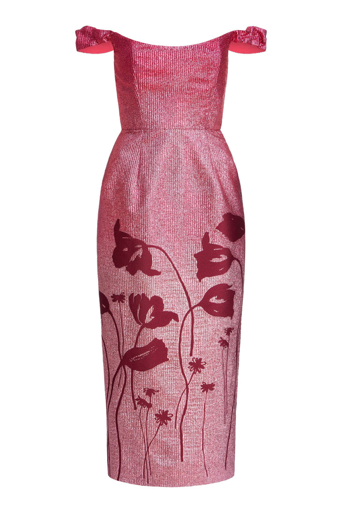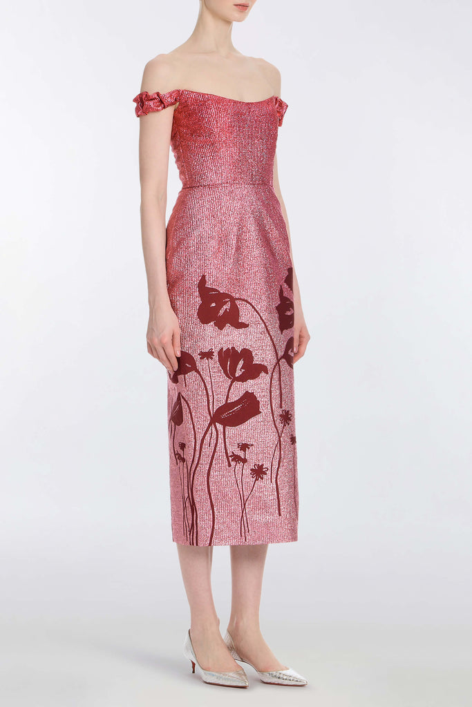 45% polyester, 34% metalized polyester, 10% nylon, 11% silk. Lining: 100% silk. Concealed zip along back. Fully lined. Made in the USA.