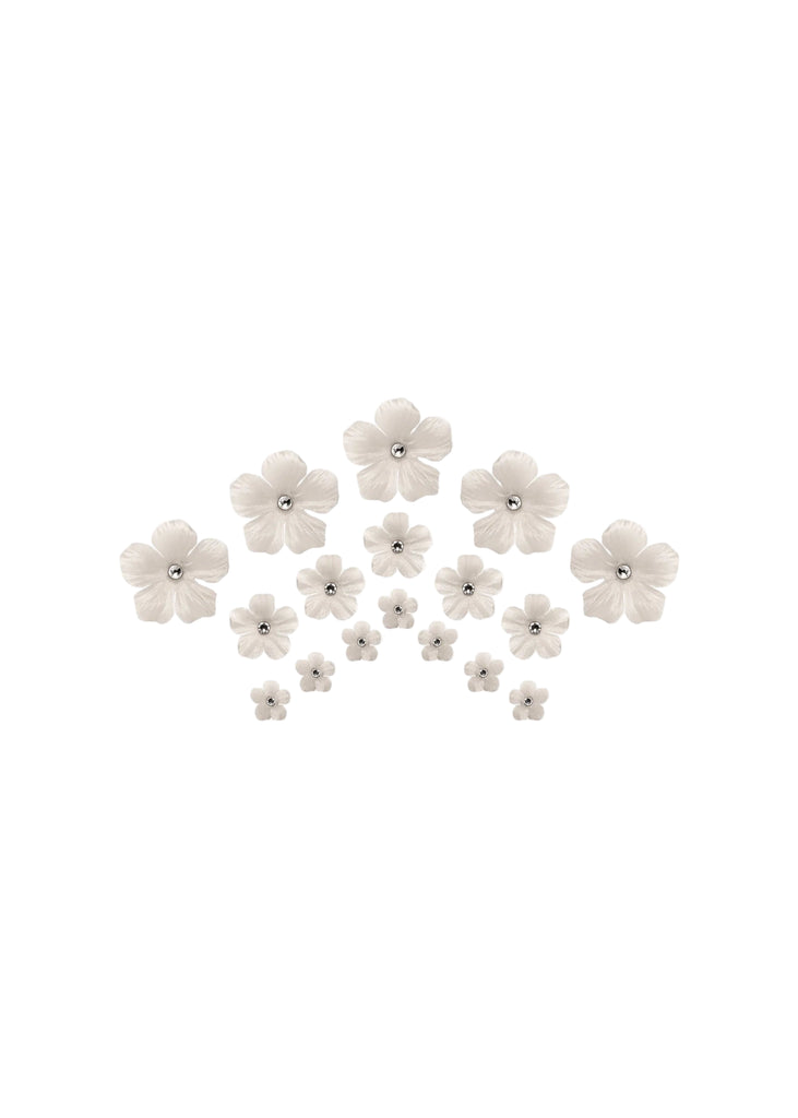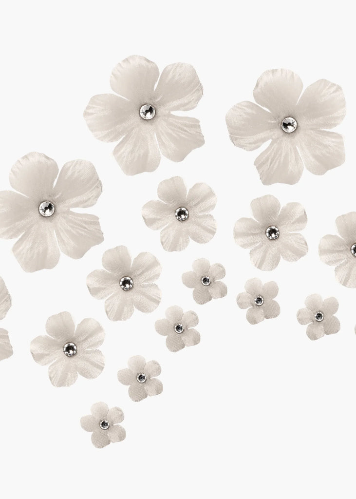 Set of fourteen silk satin-faced organza flowers with Austrian crystal or crystal-pearl centers. Magnetic closures for seamless placement. Handmade in New York City.