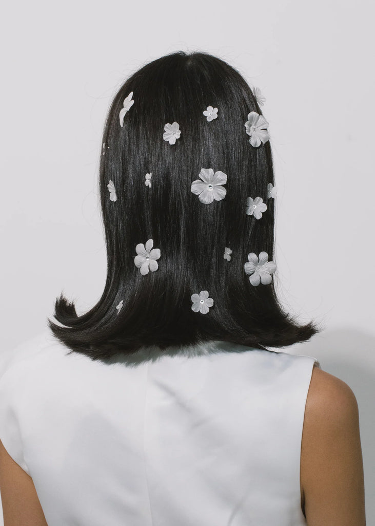 “Everything has a story to tell,” says Jennifer Behr, the founder of her namesake luxury hair accessory brand that has blossomed into one of New York City’s foremost ateliers for jewelry, as well as bridal. In every crystal, pearl, and ribbon, you’ll find the utmost quality and a sense of romance, as each piece reveals a modern interpretation of centuries-old regalia. The Anemone Hair Magnets in Crystal Cream create the enchanting illusion of flowers gently suspended in the hair. Handcrafted in New York, this set of fourteen silk satin-faced organza blooms—each centered with either an Austrian crystal or a crystal pearl—can be scattered throughout updos or flowing locks for a naturally romantic effect.