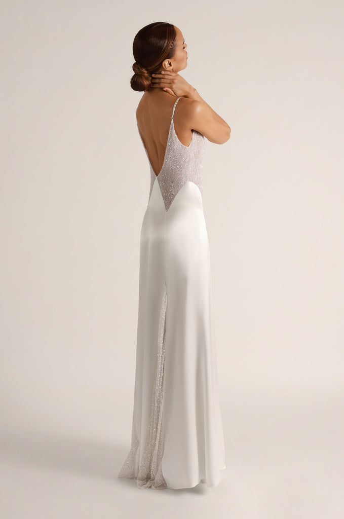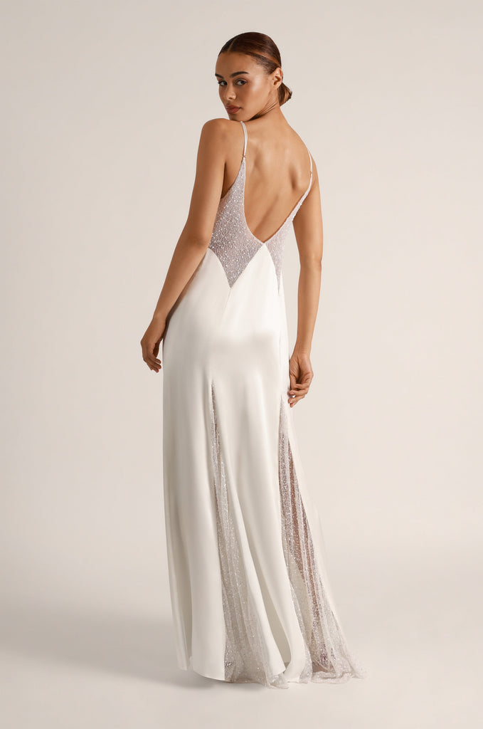 Based in New York, Kiki de Montparnasse is a lingerie, accessory, and ready-to-wear brand for those seeking a refined perspective on sensuality and seduction. These luxury collections are designed to be coveted, experienced, and enjoyed. The Ange Gown in Ivory is a breathtaking study in movement and allure, featuring a beaded French Leavers lace bodice and flowing silk charmeuse skirt. Semi-sheer tulle insets reveal a hint of skin, while the plunging neckline and low back heighten the drama. Finished with adjustable straps, this gown glides effortlessly with every step.