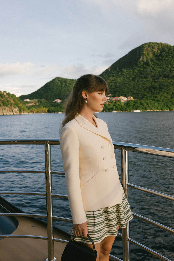 Inspired by a lifelong devotion to beauty and storytelling, Jenny Cipoletti Jewelry bridges the elegance of the past with the sensibilities of today. Each handcrafted design draws from vintage and baroque styles, celebrating jewelry’s power to connect us to our history and to ourselves. A tribute to the sun-drenched marinas of the Côte d’Azur, the Antibes Earrings blend luminous pearls with smooth cabochon jade stones, set within a rope-textured frame. Inspired by the nautical knots of the Riviera, this elegant drop design captures the effortless charm of seaside glamour—timeless, radiant, and always in motion.