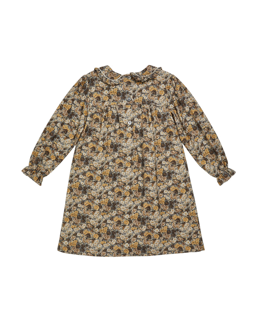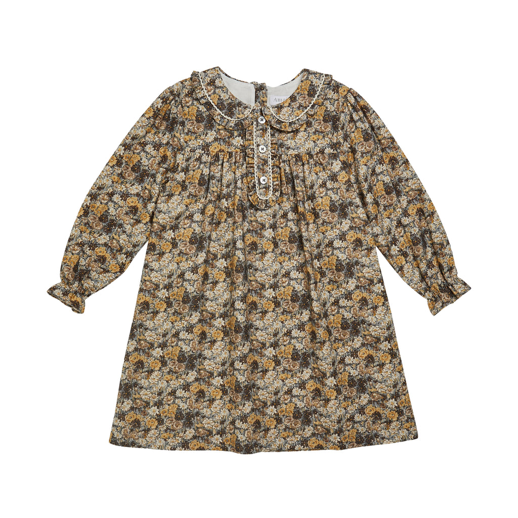 The Antoinette Dress in Floral Emerised Twill is a graceful expression of timeless elegance. Expertly crafted from soft floral emerised twill, this exquisite dress features a ruffled collar, long sleeves with elasticated cuffs, and a gently voluminous silhouette lined in airy voile for comfort and fullness. A decorative button placket adorns the front, while refined mother-of-pearl buttons at the back complete the polished look. Pair with Amaia’s classic shoes and coordinating hair accessories for an effortlessly sophisticated ensemble suited to any occasion.