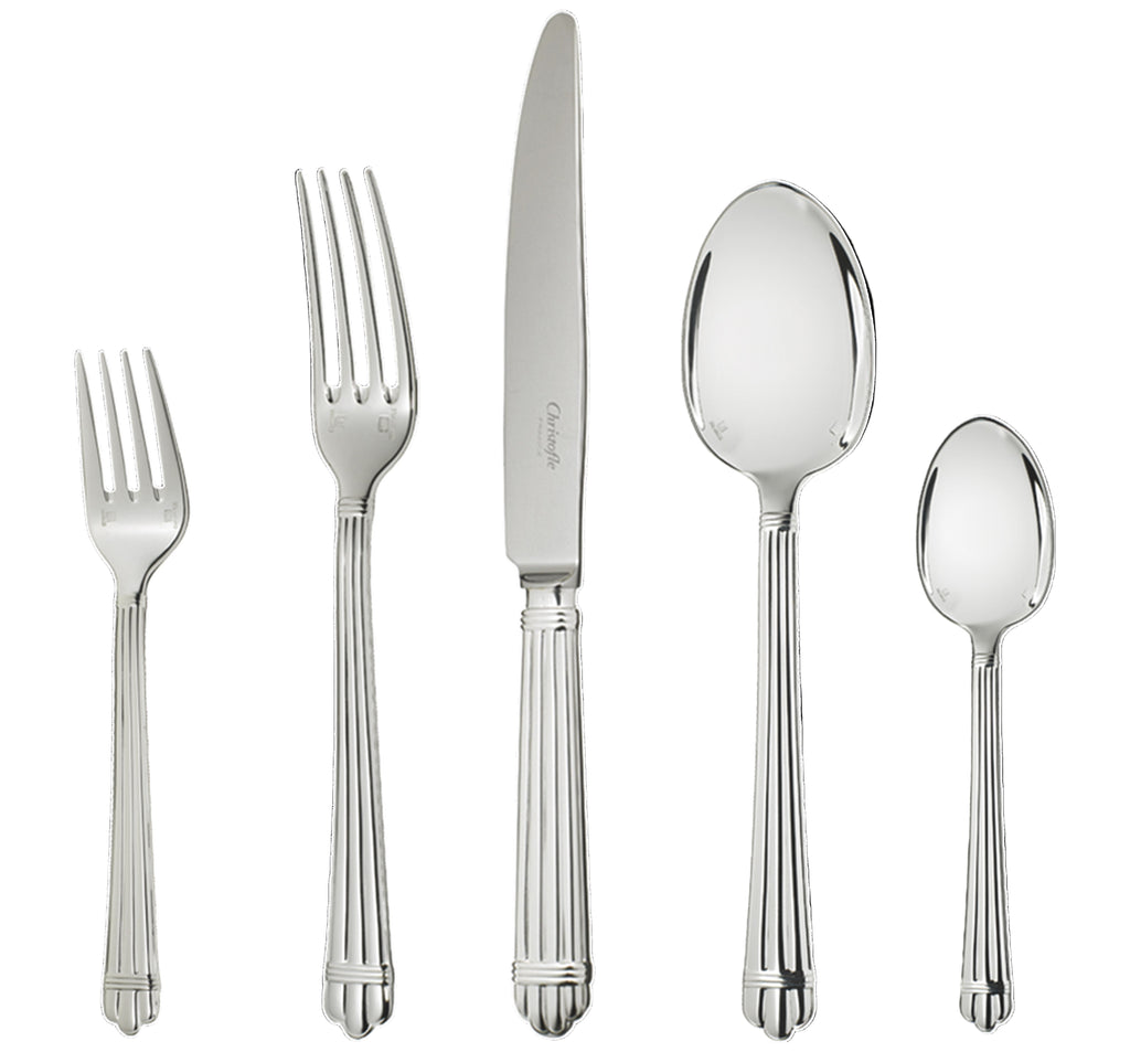 Set of 5. Silver-plated. Includes dinner fork, dinner knife, salad fork, place soup spoon, and teaspoon. Part of the Aria collection, designed by Bernard Yot. Gift boxed.