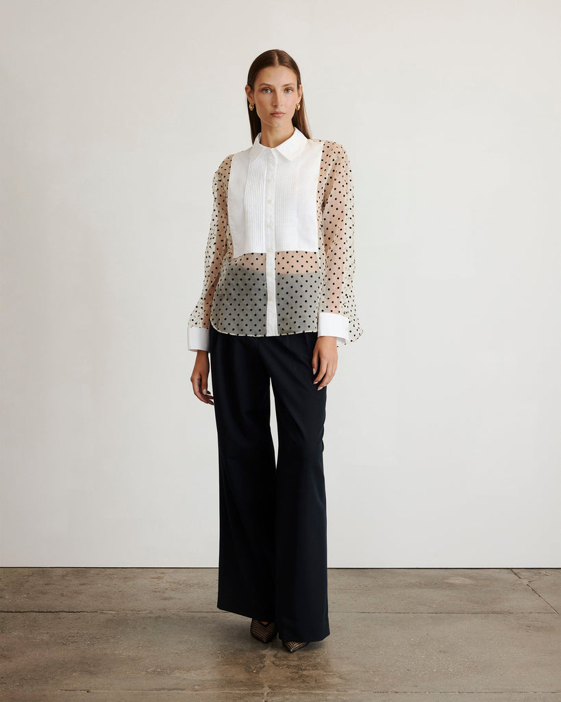 Silk organdy. Sheer polka dot fabrication. Collared neckline. Button-up front. Tuxedo bib. Long sleeves with button cuffs. Straight hem.