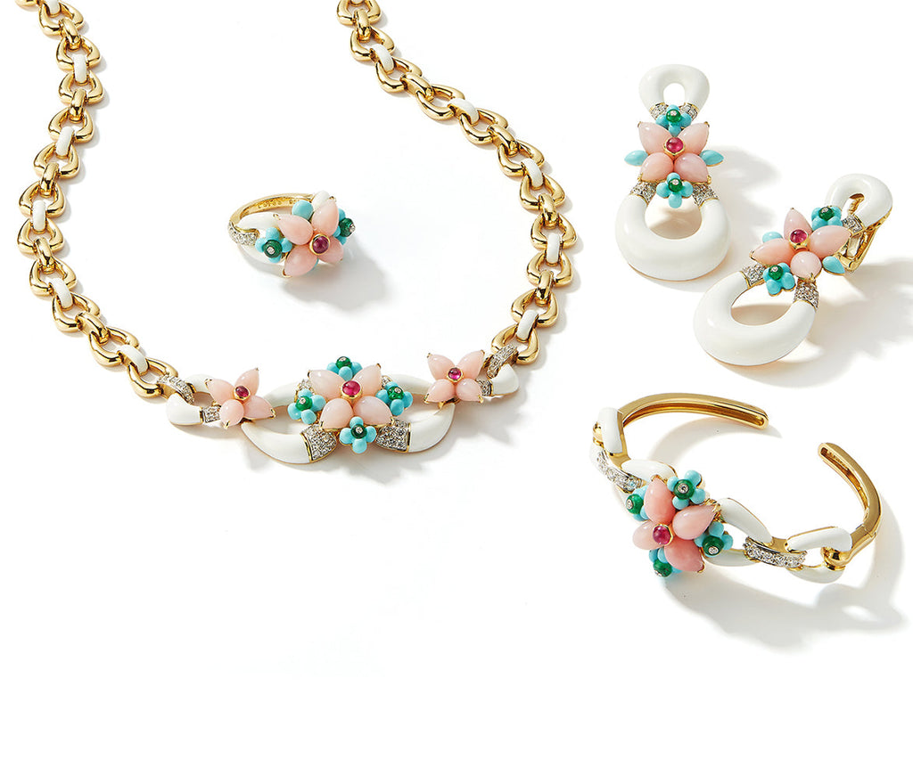 18K gold and platinum. Cabochon pear-shaped pink opals, round cabochon rubies, emerald beads, carved turquoise, brilliant-cut D-F VS1+ diamonds, and white enamel.