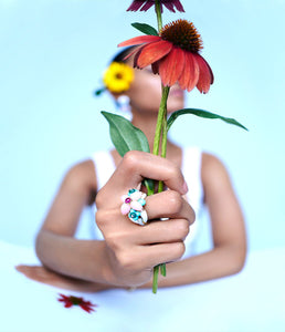 Founded in New York in 1948, David Webb has consistently redefined luxury jewelry with its bold and unique designs, crafted exclusively by master jewelers in its Upper East Side workshop. Hand-hammered gold work, colorful enamel, and signature animal pieces distinguish David Webb jewels, sought by leading tastemakers and style icons. The Asheville Ring in White Enamel, Pink Opal, and Diamonds features a floral-inspired array of cabochon pear-shaped pink opals, round cabochon rubies, emerald beads, carved turquoise, brilliant-cut diamonds, and white enamel.